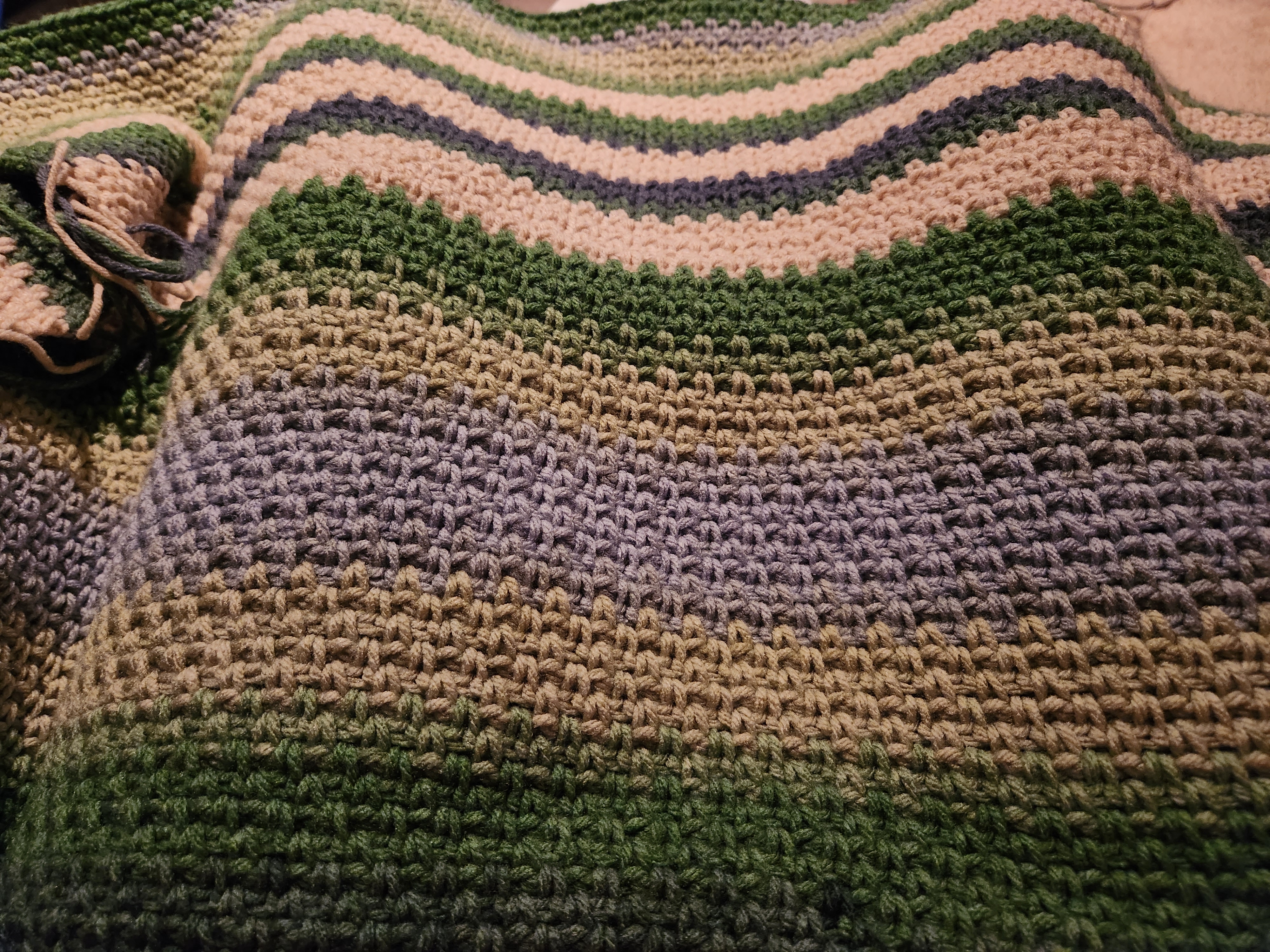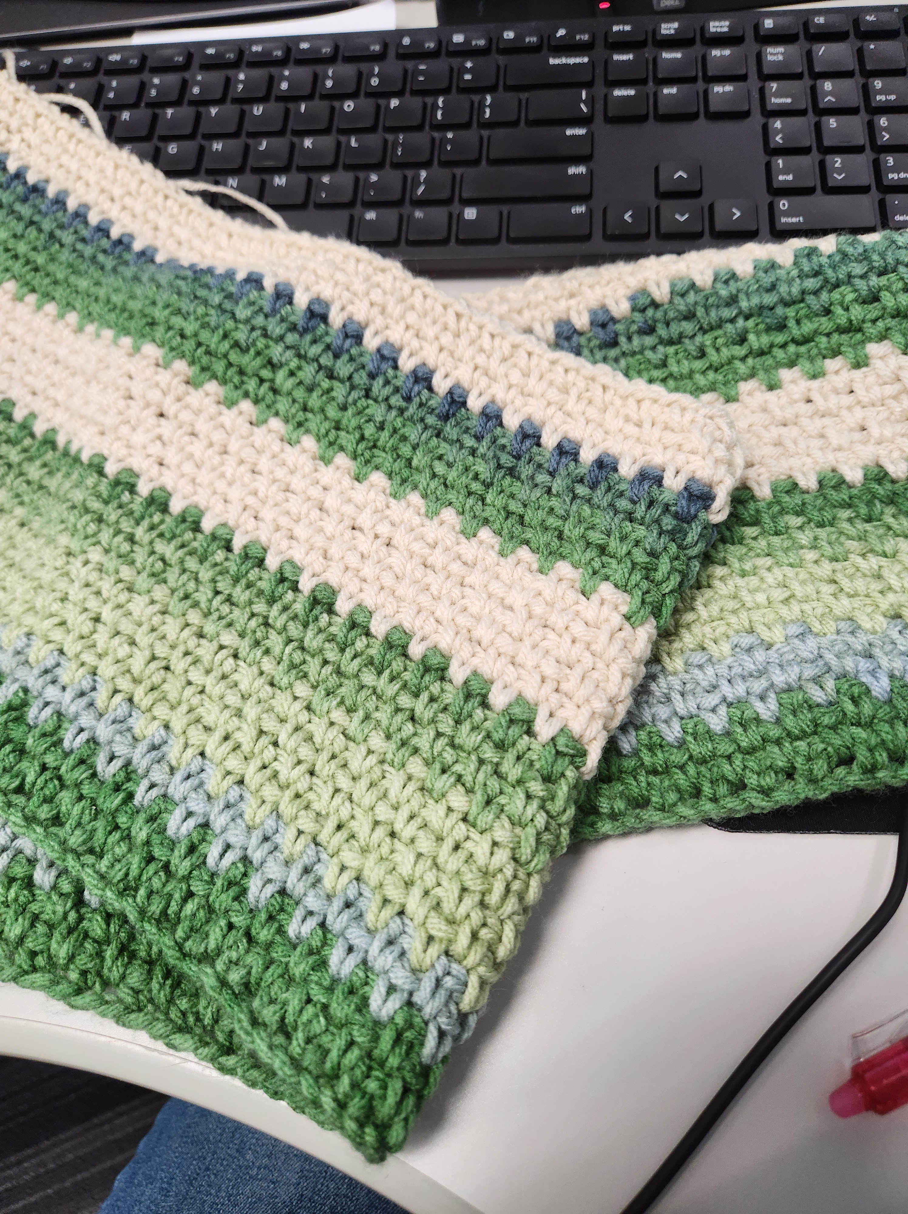 I don’t know if there’s anything more relaxing and therapeutic than the moss stitch. Becky did a phenomenal job taking this seemingly simple stitch and adding her own beautiful flare to it in the form of asymmetric stripe thickness and color changes.