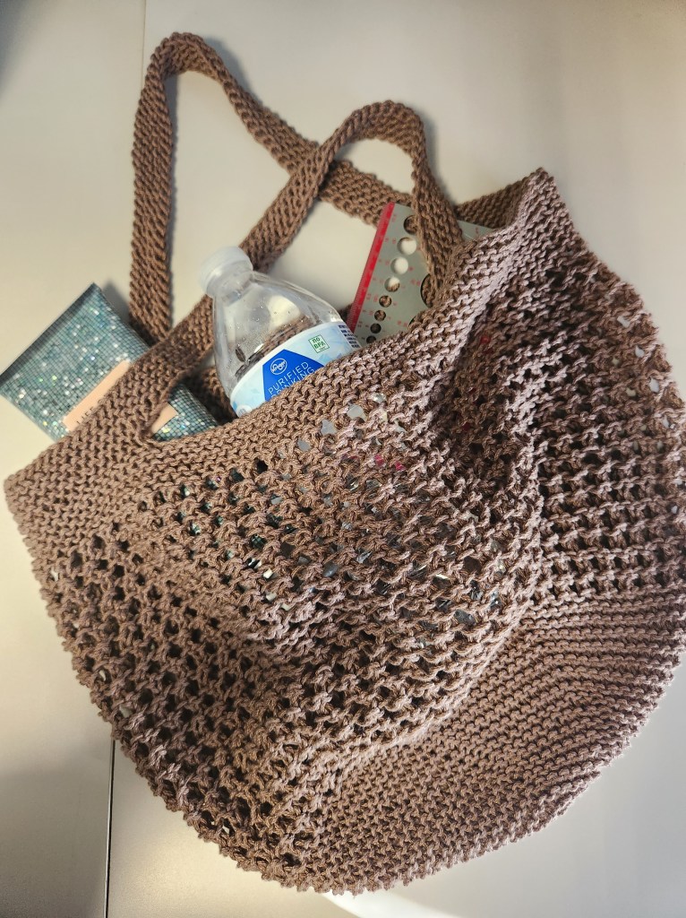 The first one I finished was the bag. It’s no shock that I’m a slow knitter. That’s actually why I opt to crochet most of the time. It’s just faster. No ifs, ands or buts about it. But when the call came out, I was in love with the way the pattern looked and I knew I had to at least apply for it. The pattern calls for cotton yarn, of which I have a ton. Like literally, a ton. I’m sure I also had the correct needles around somewhere, but I couldn’t find them easily, so to the Amazon I went.